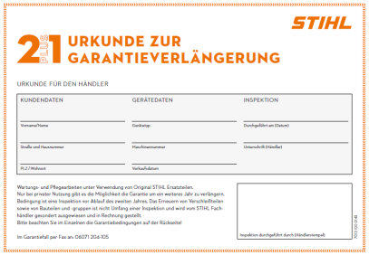 Lassen Sie einfach vor Ablauf des zweiten Jahres nach Kauf an Ihrem STIHL Gerät eine Inspektion von uns durchführen und wir verlängern den Garantieanspruch auf Ihr STIHL Gerät um weitere 12 Monate. Bestätigt wird Ihnen das durch die STIHL Urkunde zur Garantieverlängerung und das gute Gefühl, langfristig ein erstklassiges Arbeitsgerät zu besitzen.